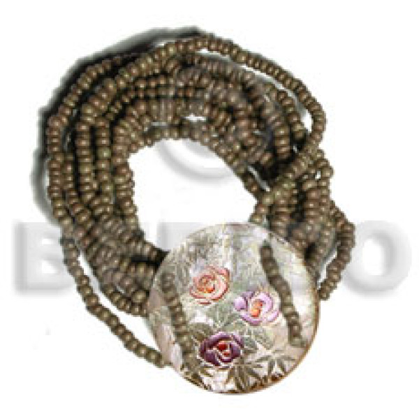 10 layers elastic dark olive green 2-3mm coco Pokalet. 35mm round handpainted hammershell..