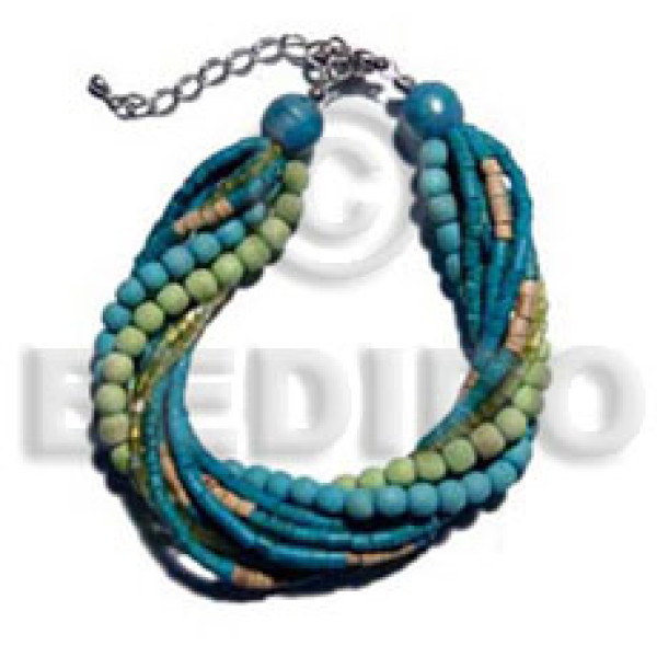 twisted 4 rows aquamarine 2-3mm coco heishe. 2 rows wood beads/3 rows cut green glass beads combinat..