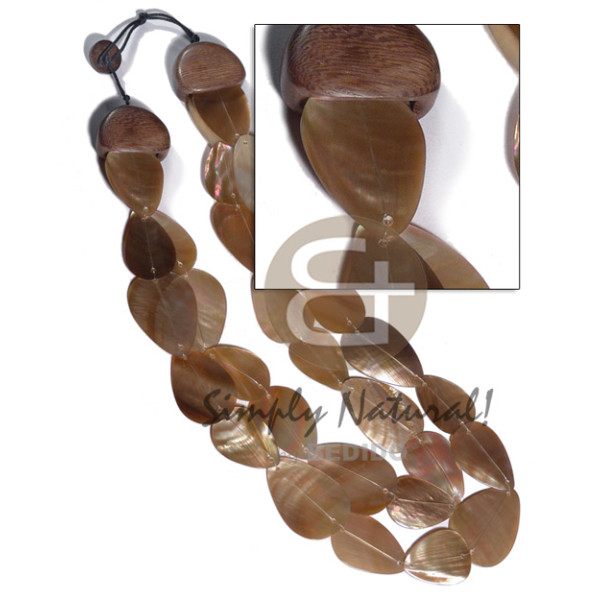 20mm round two toned capiz shells in black crisscross wax cord wood beads..