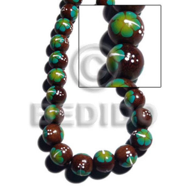 15mm robles round beads handpainted back to back aqua green / white flower..