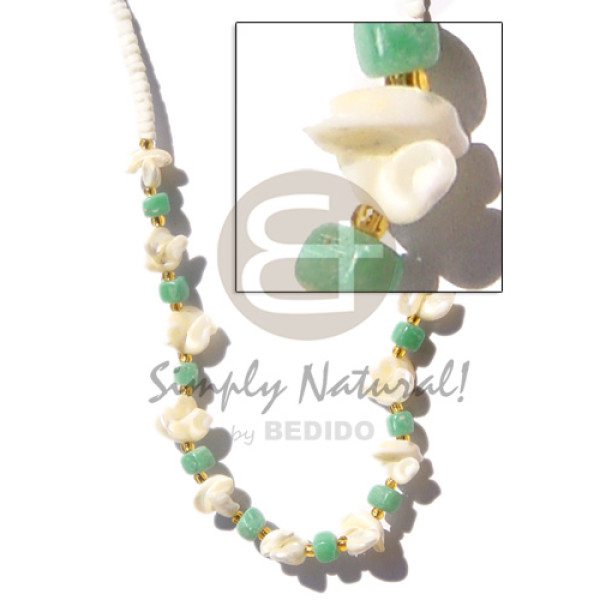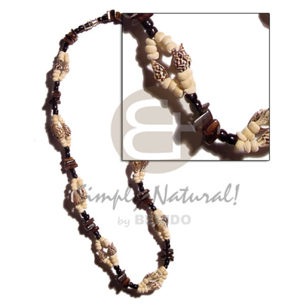 nassa tiger sq. cut brownlip, 2-3mm coco Pokalet. bleach & glass beads combination..
