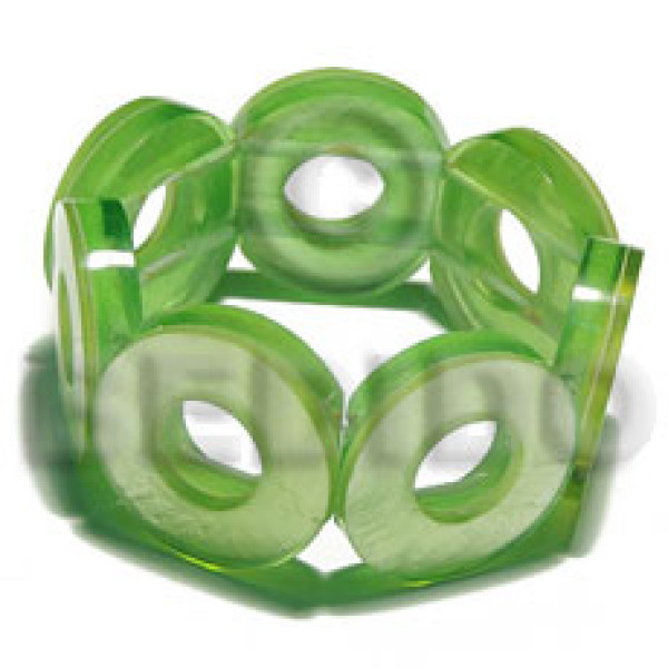 30mm capiz shell rings ( 7mm thickness ) 10mm inner hole in clear neon green resin elastic bangle..