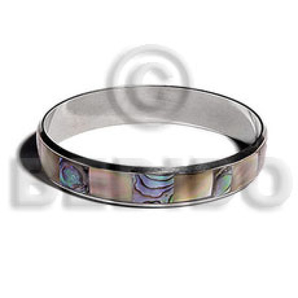 laminated brownlip/paua alternate in 1/2 inch stainless metal / 65mm in diameter..
