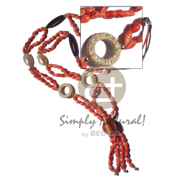 tassled 2 rows orange wax cord nassa shells pointed oval black horn, glitter wrapped wood rings and..