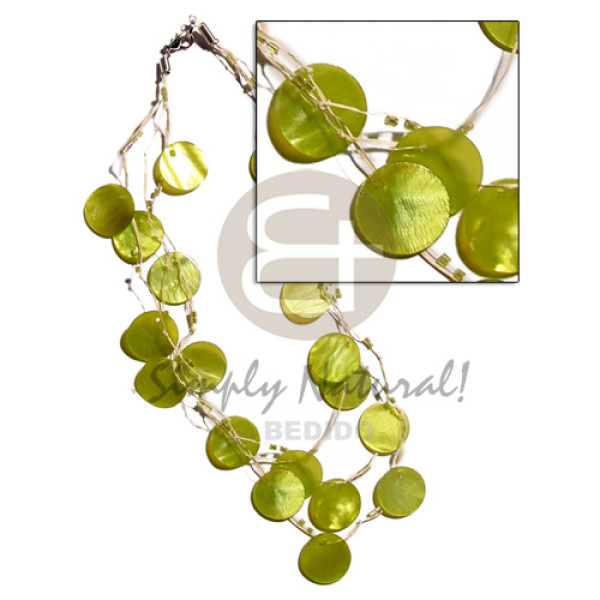 3 rows raffia in graduated length 21 pcs. round 18mm lime green hammershell and glass beads accent..
