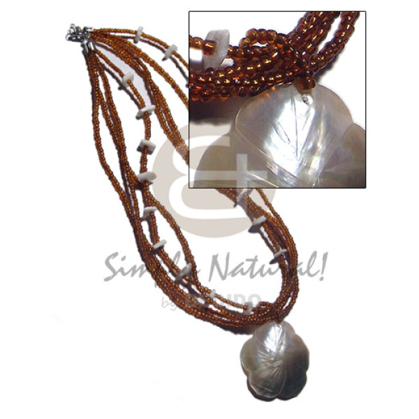 4 layers amber glass beads 45mm blacklip flower pendant white rose shell accent / 18in..
