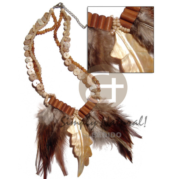3 layers horn beads and floating shell heishe feather on bamboo tube and 80mmx35mm MOP leaf pendant..