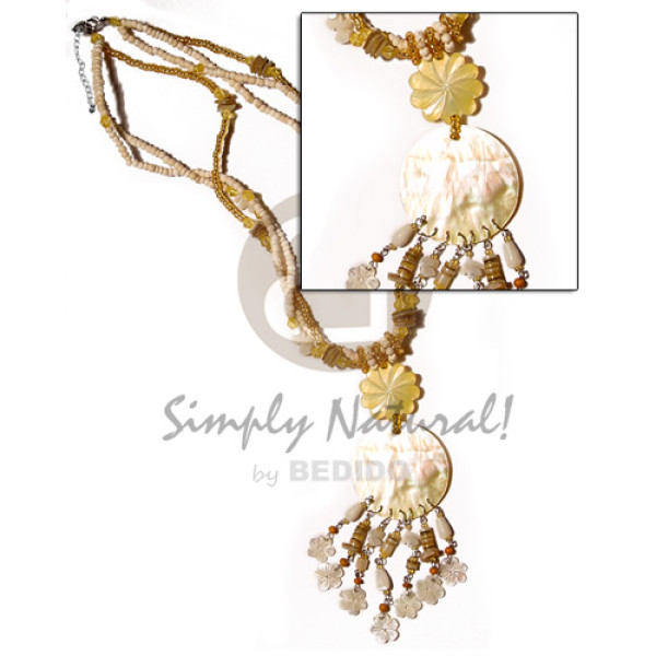 3 rows 2-3mm coco Pokalet. bleach & glass beads dangling 25mm MOP flower, 40mm MOP round pendant l..