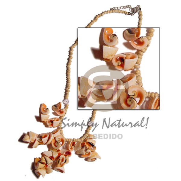 45mm brownlip blocking pendant in 2 rows 2-3mm coco heishe bleach/buri & wood beads combination..
