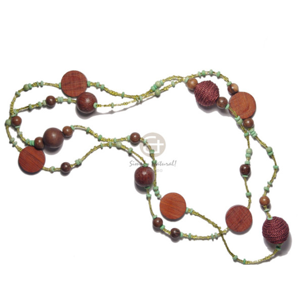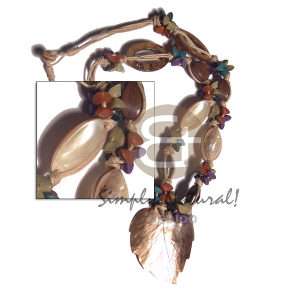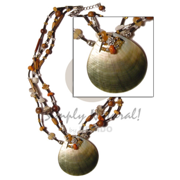 55mm brownlip round shell pendant in 3 layers wax cord wood & buri nuggets beads accent..