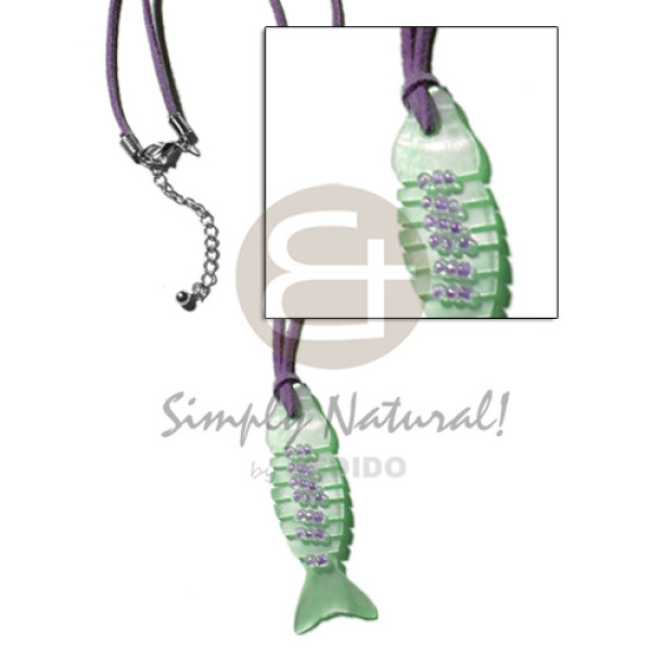 mint green fishbone hammershell glass beads in lavender leather thong..