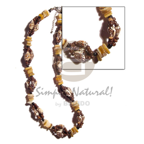 nassa tiger sq. cut brownlip, 2-3mm coco nat. brown Pokalet., gold lip sq. cut & glass beads combin..