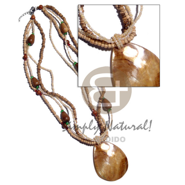 4 layers 2-3mm coco Pokalet. & glass beads shell accent brownlip 45mm pendant..