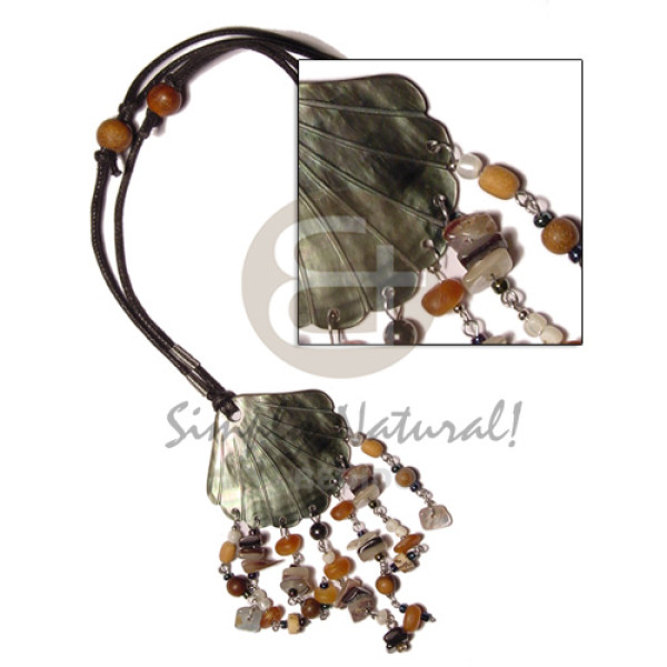45mm blacklip dangling shell, wood & horn beads looping tassles on adjustable wax cord..