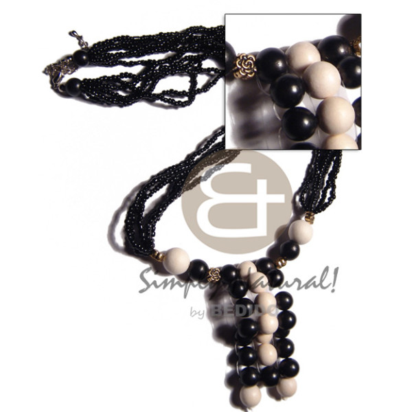 black and white tones of 10mm wood beads in 6 rows glass beads / 20in / ext. chain..