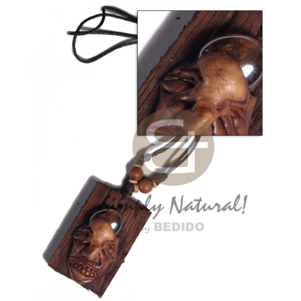 clay skull on 60mmx40mm rectangular driftwood gemstone accent /adjustable black wax cord /tribal c..