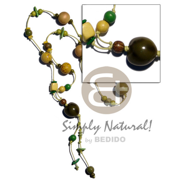 36 in. tassled wax cord painted marbled & asstd. wood beads colored kukui nut / green/yellow tone..