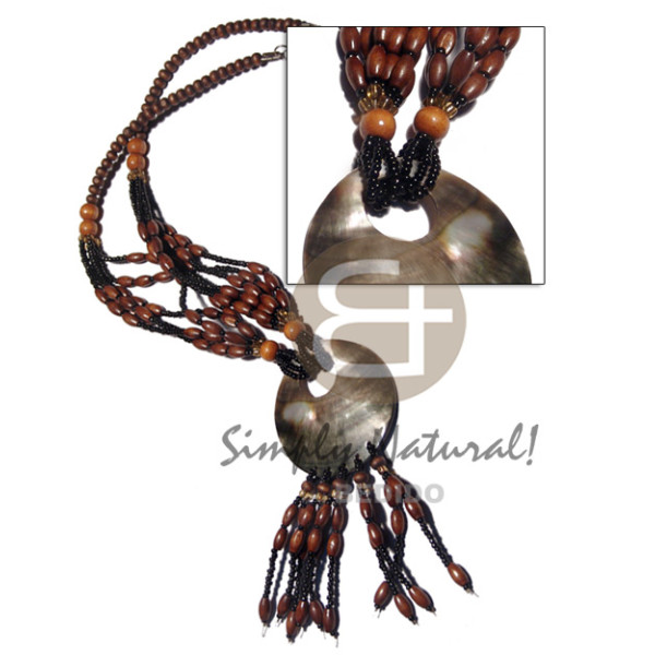 6mm brown. nat. wood 6 layers black glass beads and lacquered 10mm rice beads brown nat. wood tass..