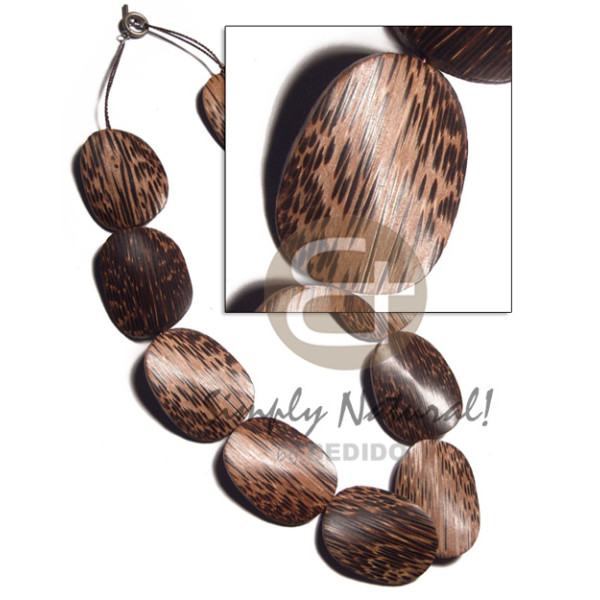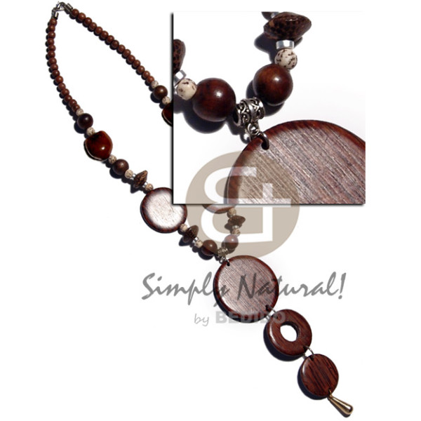 round woods beads brown kukui nuts, buri tiger seed, two 35mm palmwood circles and dangling gradua..